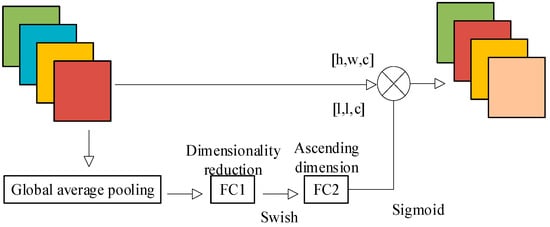 During the Squeeze phase, the SE module utilizes the global averaging pooling operation to compress the two-dimensional characteristics of each channel into a single real number. This compression reduces the feature map from a size of [h,w,c] to [1,1,c] [34]. The process of the SE module is shown in Figure 7.
