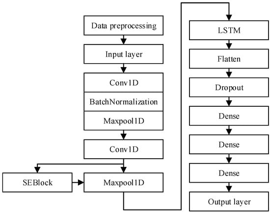 This model utilizes a CNN as its primary architecture, with an SE module added to extract effective features and suppress less important ones. The preprocessed data are fed into the model, where it is first processed by three convolutional and pooling layers. The first layer, Conv1D, uses 128 filters with a convolutional kernel size of 20 and a stride of 3 and is equipped with batch normalization and max-pooling layers. The second layer, Conv1D, uses 32 filters with a convolutional kernel size of 7 and a stride of 1 and is also equipped with batch normalization and a max-pooling layer. The third layer, Conv1D, uses 32 filters with a convolutional kernel size of 10 and a stride of 1 and is used in conjunction with the SE module to dynamically adjust the weights of the features [36]. After these convolutional and pooling operations, the data are passed through an LSTM layer to extract temporal features. The LSTM layer is followed by a flattening layer to unfold the 3D feature map into a 1D vector. Subsequently, a Dropout layer is used to prevent overfitting, and the results are passed through two fully connected layers (using 20 and 10 neurons, respectively, with ReLU as the activation function). Finally, the 5-class classification results are produced through the Softmax activation function. The detailed layer structure information of the model, including input dimensions, output dimensions, kernel sizes, pooling sizes and other related information, is listed in Table 1.