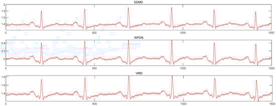 Table 2 lists the evaluation index of the noise reduction effect of the three methods. It can be seen that the EEMD denoising method has the highest SNR, the smallest RMSE, and the best correlation coefficient compared with the other two methods. Since the experimental signal is the same and other conditions remain unchanged, the method proposed in this paper achieves the highest SNR compared to the control method, indicating that the mode-mixing problem has affected the denoising performance. Meanwhile, the wavelet packet denoising, VMD denoising, and EEMD denoising methods maintain good amplitudes, and the waveforms after denoising are smooth. Only certain points exhibit oscillation, but the EEMD method is comparatively gentler than the other two methods, which indicates that the method proposed in this paper is superior to the contrast noise reduction method in addressing the mode aliasing problem. It is capable of preserving the valuable information of the original signal while efficiently eliminating noise.