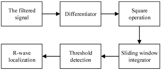 The R-wave is the most obvious peak of the QRS complex waveform and contains the most useful information of features of the whole heartbeat. In this paper, the Pan–Tompkins algorithm is adopted for R-wave positioning. Figure 13 shows the flow chart of the R-wave positioning process.