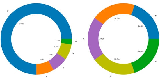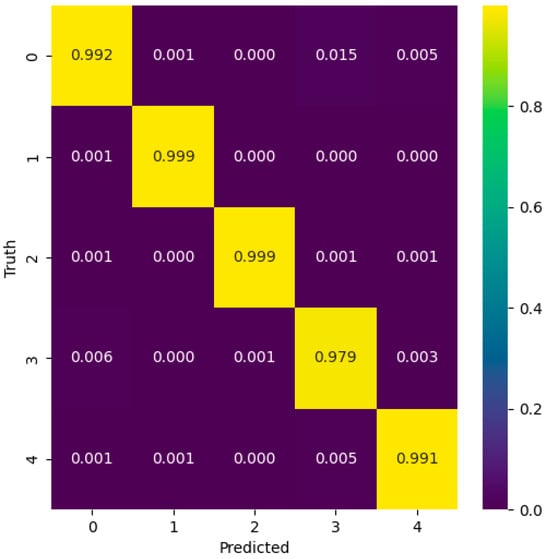 This study utilized three classification evaluation indexes, Precision, Recall, and F1 Score, to assess the model’s performance. The confusion matrix of the ECG signal classification results is shown in Figure 24. The values for the three evaluation indexes of ECG-type classification are listed in Table 5 [35]. Here, the probability of classifying the ECG signals can be put into five labels: N (normal beat), A (atrial premature beat), V (ventricular premature beat), L (left bundle branch block), and R (right bundle branch block).