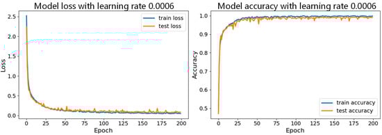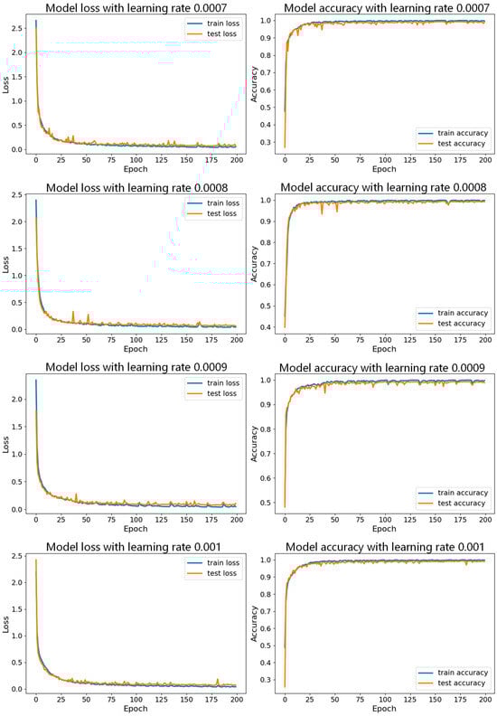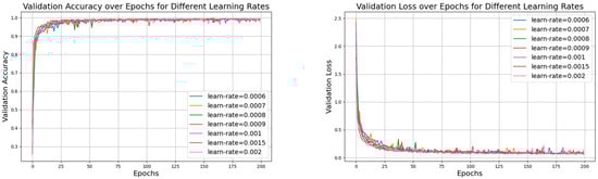 From Figure 17, the curve for the learning rate of 0.001 is relatively smooth with minimal fluctuations, indicating that the model performed more stably throughout the training process, consistently maintaining high accuracy and effectively avoiding issues of overfitting or underfitting. In Figure 19, the curve for the learning rate of 0.001 drops rapidly during the initial stages of training and then remains at a low level in subsequent stages. In contrast, the curves for the other six learning rates show significant fluctuations in validation loss, which could lead to large errors during training and potentially cause overfitting. Therefore, compared to the other learning rates, the learning rate of 0.001 demonstrates superior stability and reliability.