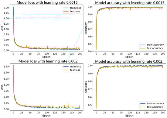 Comparison of model performance for learning rates of 0.0015 and 0.002 with batch size of 150.
