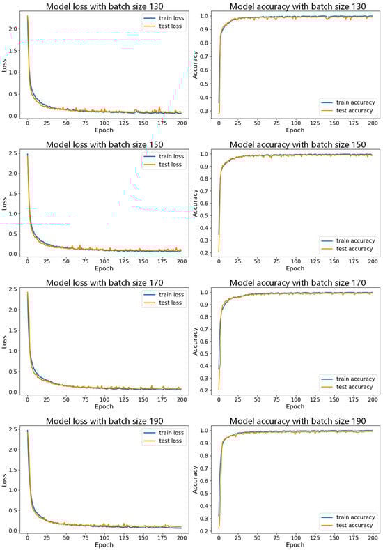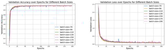 In Figure 21, the accuracy curve with a batch size of 150 appears smoother and less volatile, indicating that the model performs more stably during training and validation, and consistently maintaining high accuracy and effectively avoiding overfitting or underfitting. Figure 22 and Figure 23 show the comparison of model performance for various batch sizes, in which the curve with a batch size of 150 drops rapidly in the early stages of training and remains at a lower loss level in the subsequent phases. Compared to other batch sizes, the loss curve with a batch size of 150 shows less fluctuation, suggesting that the model converges faster during training and can maintain a lower validation loss.