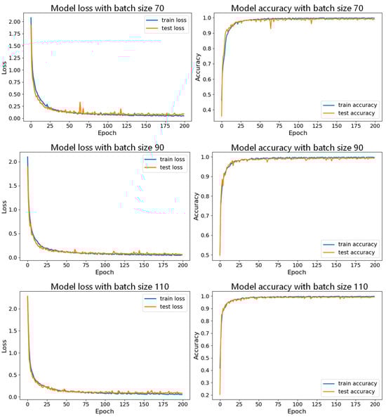 Comparison of model performance for batch sizes of 70, 90, and 110 with learning rate of 0.001.