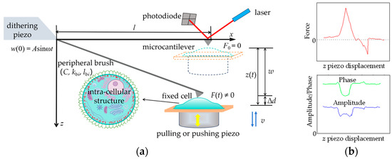 As shown in Figure 1, the dynamic force-clamp mode is a potential AFM-based detection method, which is different from AFM tapping mode [20,21]. There are two piezo drivers in the detection system. The distance between the cell and the free-end of the microcantilever is changed by pulling or pushing the right-hand piezo driver to make the cell strained or compressed while a small-amplitude dithering is simultaneously applied to the fixed-end of microcantilever by the left-hand piezo driver with a low-driving frequency (i.e., 40–240 Hz). So, the multi-channel signals of the interaction force (static force signal) between the microcantilever tip and cell sample, the amplitude and phase of microcantilever motion can be collected simultaneously [20]. The length of the microcantilever is l, and the origin of coordinate z is located at the position where the interaction force between the fixed cell and microcantilever tip is zero, i.e., F0 = 0. A small periodic excitation displacement at the left-hand fixed-end is w(0) = Asinωt, and the displacement and movement speed of the right-hand piezo driver are z(t) and v(t), respectively. The above two kinds of excitations induce the microcantilever–cell system, generating the following responses: w(x, t) and F(t), where w(x, t) is the bending deflection of microcantilever in z direction and F(t) is the interaction force between the deformed cell and microcantilever tip. The total deformation of cell is , .