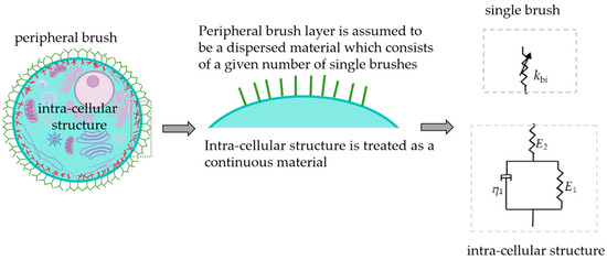 Previous experimental studies have shown that the peripheral brush is composed of membrane protrusions, such as microvilli, microridges, cilia, and molecules grafted to the cellular membrane, such as glycosaccharide and glycoproteins (glycocalyx) [27]. In some SEM and EM scanning experiments, there were a lot of microvilli on the cell surface [1], which was regarded as a columnar structure, and included the microfilaments [29]. The molecules, microvilli, microridges, and cilia are usually characterized by the single/double brush model, elastic/viscoelastic model, freely jointed chain model (FJC), and worm chain model (WLC) [1,17,20,28]. The cell thickness is about 2–15 μm [30]. The length of the peripheral brush layer is 0.1–5 μm, which is 1/10–1/3 of the overall length of cell [1,27,31]. Based on the above research, as shown in Figure 2, the peripheral brush layer is coarsely grained into a given number of springs (disperse model), and the single brush is assumed as a nonlinear elastic spring, while the intra-cellular structure is simplified as a continuous viscoelastic cylinder (standard linear solid model) [21,30,32].
