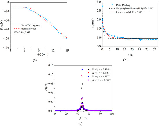 The present analytical result is compared with the experimental results of Chtcheglova’s et al. by using Equation (15) [28] in the AFM tensile experiment (quasi-static contact mode). As shown in Figure 3a, the segmental stiffness of the peripheral brush are taken as kb1 = 0.00078 N/m and kb2 = 0.0125 N/m, which are consistent with the range of elastic constants (0.0001–0.025 N/m) of a single protein molecule determined by Chtcheglova et al. [28]. The coefficients of determination (R2) for the piecewise curve fittings based on the present model are 0.944 and 0.982. In the AFM relaxation experiment (quasi-static contact mode), the present analytical result based on Equation (17) is compared with the experimental results of Darling’s et al. [30]. As shown in Figure 3b, when the peripheral brush is considered, the determination coefficient for the curve fitting based on the present model is 0.958; while, when the peripheral brush is not considered (SLS model), the determination coefficient for the curve fitting is 0.927 [21]. The fitted cellular parameters are listed in Table 1. However, from Table 1, the mechanical parameters fitted by the present model and its reduced model (no brush) [21] are significantly different from those obtained by the Darling’s model due to different theories and cell constitutive models. It indicates that the present model, which considers the cellular microstructures (i.e., peripheral brush and intra-cellular structure), can better fit the relaxation experiment data. In AFM dynamic force-clamp mode, the amplitude–frequency curve for the dynamic response of the microcantilever is obtained by using Equations (22)–(24). The previous studies suggest that a low frequency excitation with small excitation amplitude seems eminently suitable for detecting biomolecular viscoelasticity under AFM dynamic force-clamp mode [21], and this frequency is not only higher than the resolutions of the detection frequency (i.e., 20 Hz) and amplitude (i.e., 0.2 nm), but also far from the thermal noise frequency (i.e., 500 Hz). As shown in Figure 3c, the numerical result converges rapidly with the increase in discretized point number N by using Gauss–Chebyshev–Lobatto–type distribution; when N = 9, the numerical results converge. The good consistencies demonstrate the convergence of DQM, and this validates the present method.