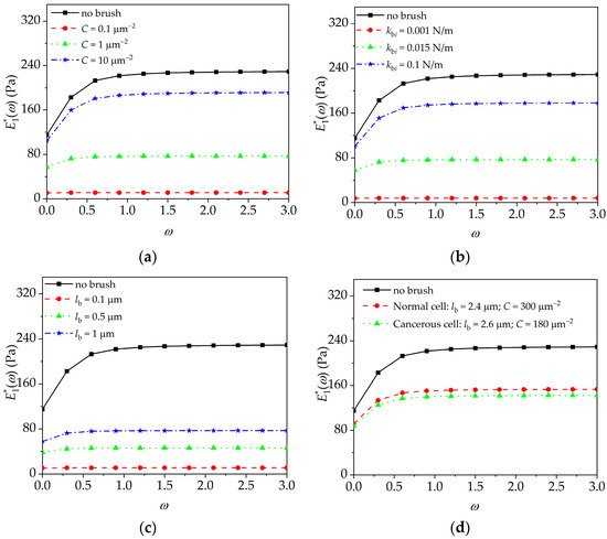 Peripheral brush effect on the energy storage modulus of normal and cancerous cells. (a) Brush density (lbi = 1 μm, kbi = 0.015 N/m); (b) segmental stiffness (lbi = 1 μm, C = 10 μm−2); (c) brush length (kbi = 0.015 N/m, C = 10 μm−2); (d) peripheral brushes of normal and cancerous cells (kbi = 0.01 N/m).