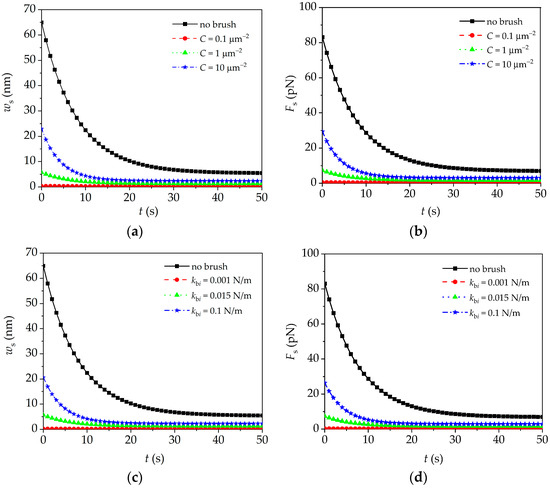 where fb and fi represent the force per unit area in brush layer and the force of single brush, respectively; C is the brush density; kbi and Ebi are the segmental stiffness of single brush and the elastic modulus of brush layer, respectively; and , , and are the tensile/compressive displacement, the strain, and the length of single brush, respectively.