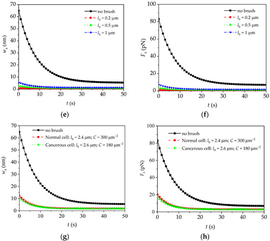 In AFM quasi-static mode (AFM relaxation experiment), the initial static displacement of substrate is fixed (i.e., z0 = 200 nm). The influence of the brush density, segmental stiffness, and brush length on microcantilever quasi-static responses (i.e., the time–history curves of the deflection and interaction force) will be investigated by using Equation (17). In calculations, the viscoelastic parameters of the intra-cellular structure of JJ012 cells are as follows: e0 = 230 Pa, e1 = 210 Pa, and α = 0.125 s−1 [30]. Substituting Equation (17) into Equation (15b) yields the interaction force between the tip and cell, i.e., . As shown in Figure 5a,c,e, the quasi-static deflection of the microcantilever decreases when the peripheral brush is considered, whereas it increases with the increase in brush density, segmental stiffness, and brush length. This is due to the obvious effect of the peripheral brush on the overall mechanical properties of the cell, which leads to the decrease or increase in the interaction force between the microcantilever and the fixed cell, as shown in Figure 5b,d,f. Furthermore, as we can see in Figure 5g,h, for the human cervical epithelial cells, when the cell becomes cancerous, the density of the peripheral brush decreases significantly, which results in a decrease in the interaction force and quasi-static deflection. The above results show that the change in the peripheral brush has a significant effect on the quasi-static signals of the microcantilever, which can be used to identify the physical parameters of the peripheral brush, which is helpful for distinguishing the normal cells and cancerous cells.