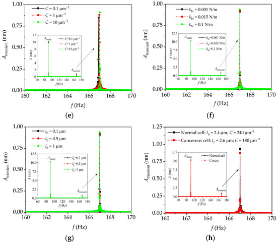 As shown in Figure 6a–d, the interaction force becomes stronger with the increase in the brush density, segmental stiffness, and brush length; when the cell becomes cancerous, the density of the peripheral brush decreased significantly, and these changes induce a decrease in interaction force. The results show that the change in the peripheral brush has a significant effect on the interaction force in AFM dynamic force-clamp mode, which could be used to identify the physical parameters of the peripheral brush, and this may be helpful for distinguishing the normal cells and cancerous cells. As shown in the inserts of Figure 6e–g, within the frequency (i.e., f) range of 0–200 Hz, there are two peaks (i.e., double-peak resonance) in the amplitude–frequency curve: one peak lies in the lower frequency domain, and the other lies in the higher frequency domain. This reminds us of the double-peak resonance phenomena for cell detection in our previous work [21]. The similar point of the previous work in Ref. [21] and the present study is as follows: multiple signal peaks appear in the amplitude–frequency curves for the same vibration mode. However, the interests are different. With the increasing brush density, segmental stiffness, and brush length, the higher frequency peak amplitude increases prominently, whereas the lower frequency peak amplitude and the interval between two peaks seem unchanged. In fact, this is because with the increasing brush density, segmental stiffness, and brush length, the increase in cell modulus at the higher frequency is more remarkable than that at the lower frequency, as shown in Figure 4. Furthermore, as shown in Figure 6h, the amplitude of the higher frequency peak decreases with the canceration of the cell, which is due to the changes in the density and length of the peripheral brush.