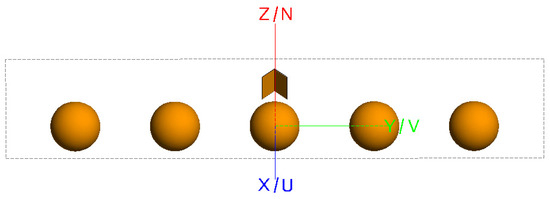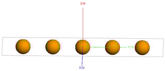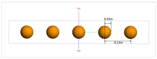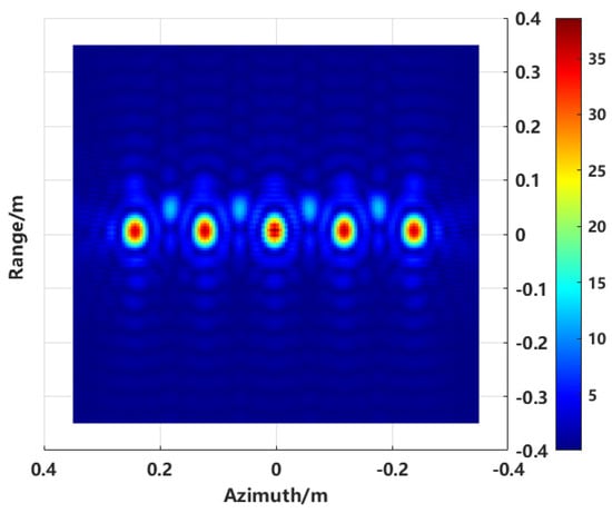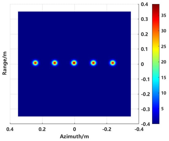 To visually analyze the effects of conventional imaging, the FEKO2020 software was used to model and calculate scattering data. Imaging was performed using the conventional back-projection (BP) method. Figure 2 shows the model of five metal spheres, each with a diameter of 0.06 m, arranged laterally. The distance between the centers of two adjacent spheres is 0.12 m. Figure 3 presents the imaging results.