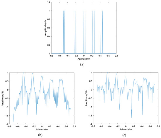 1D azimuth imaging results. (a) True values of point targets, (b) imaging without noise, and (c) imaging with noise.