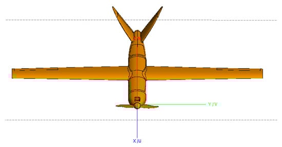 Turntable imaging obtains high-resolution two-dimensional images of the target by utilizing a wide frequency band and large azimuth observation angles. This approach provides a scattering intensity distribution map of the target by coherently summing wideband and wide-angle sampled signals at each imaging point. The wide frequency band and large angle determine the range and azimuth resolutions of the image. To capture more scattering information about the target, data from a wide azimuth angle range are combined to improve the azimuth resolution. However, considering the anisotropic scattering characteristics of the target, the equivalent scattering centers of the target will vary with different viewing angles [24]. To visually analyze the target’s anisotropic scattering, electromagnetic data from a CAD model of an aircraft were simulated. The CAD model of the aircraft is shown in Figure 5. The experimental simulation parameters are as follows: a center frequency of 10 GHz, a bandwidth of 4 GHz, sampling interval is 40 MHz, an azimuth angle range from −30° to 30°, and an angle interval of 0.2°. Figure 6a–d shows the target images generated using different sub-aperture echo data, with sub-aperture center angles of −12°, −2°, 2°, and 10°, respectively.