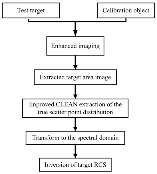 The overall workflow for the imaging inversion method is illustrated in Figure 11. The process involves enhancing the imaging for both the calibration target and the test object, followed by extracting the two-dimensional image of the area of interest. Subsequently, the sequence CLEAN method is applied to recompose a clean image. Finally, the RCS of the target is inversely derived using the transformed relationship between the image and the echo electric field.