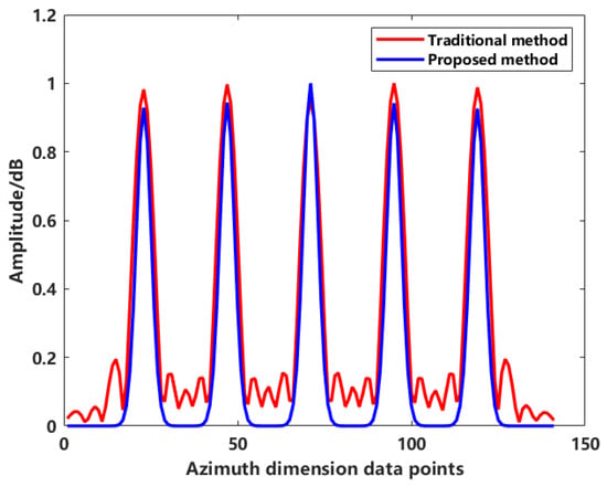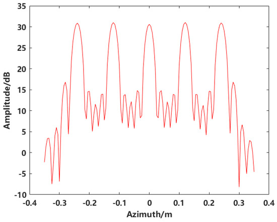 For the azimuthal profile analysis of the target imaging, the Peak Sidelobe Ratio (PSLR) is assessed to evaluate the imaging quality for the simulated discrete single composite target. The azimuthal profiles of both the conventional imaging and the synthesized image after scatterer extraction are analyzed. Figure 14 shows the profile for conventional imaging, with a PSLR of −15.77 dB. In radar signal processing systems, a PSLR greater than 30 dB is typically required. Therefore, the conventional imaging result has significant sidelobes and does not meet the requirement. In contrast, the image obtained after scatterer extraction exhibits no sidelobes, with the PSLR corresponding to the maximum intensity of the scatterers.