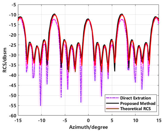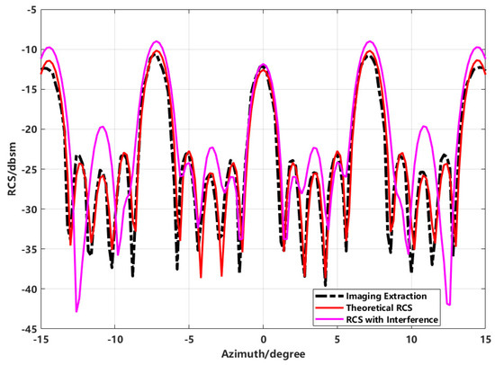 The solid line represents the RCS theoretically calculated for the entire target, including the dihedral interference. The black dashed line corresponds to the RCS of the spherical array reconstructed through image extraction. Compared with the curve containing interference, notable fluctuations occur in the angular domain between individual spheres, especially at the frontal view. This is primarily due to mutual coupling between the targets containing the interference source that was not corrected through image extraction. By extracting the spherical array’s image from the interfered target and comparing it to the theoretical RCS of the target without interference, it is evident that the proposed imaging extraction method can effectively separate the scattering contributions of the interference source from those of the target.