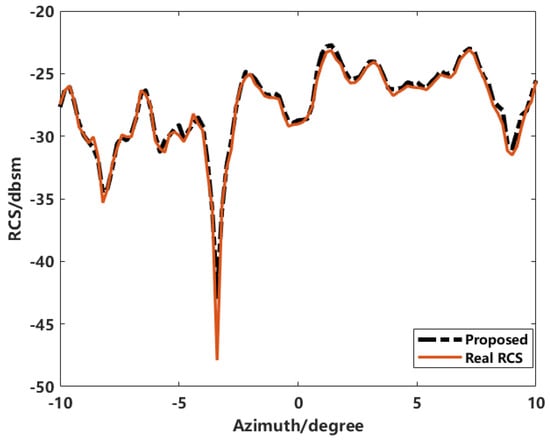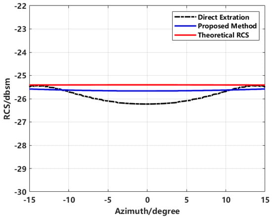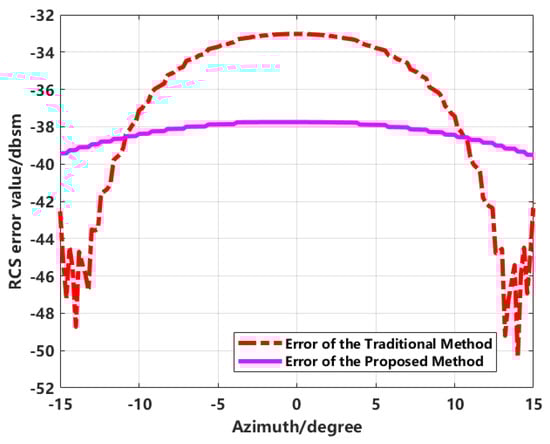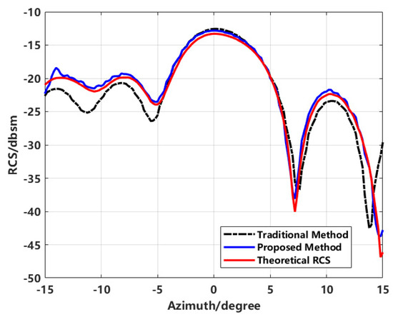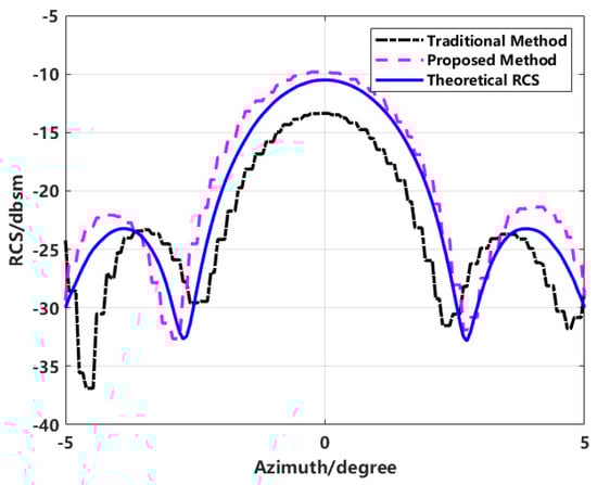 The analysis above demonstrates the advantages of the proposed method in sidelobe suppression, which serves as the basis for comparing the final RCS measurement accuracy. The final RCS measurement accuracy is calculated using both the traditional method and the enhanced imaging scattering center method proposed in this study. The results are then compared with the theoretical RCS values, as shown in Figure 28.