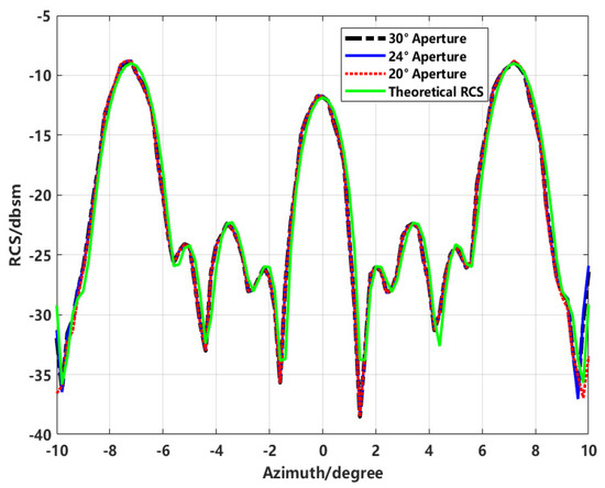 To investigate the angular aperture limit for accurate RCS inversion based on imaging results, we applied the model shown in Figure 17. Using a 0° angle as the aperture center, we performed RCS inversion within ±10° azimuth angles based on simulation data covering ranges of 30°, 24°, and 20°. The comparison results are illustrated in Figure 23.