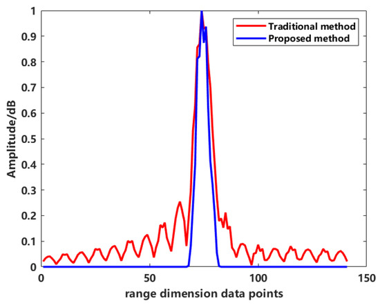 Figure 27 shows the normalized results. In the range profile obtained using the traditional method, the central point corresponds to the target area, and the sidelobes on both sides of the main lobe exhibit oscillations characteristic of an SINC function. These oscillations indicate that the 2D image generated by the traditional method is affected by significant clutter. However, analyzing the results of the proposed method in Figure 27, the central position corresponds to the target area, and the middle section represents the scattering points that correspond to the target’s physical structure. Outside the target area, the sidelobes in the profile are clearly visible. From the vertical axis of the graph, it is evident that the sidelobe values drop sharply compared to the traditional method, effectively suppressing clutter.