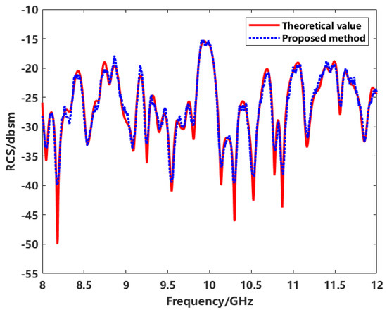It is well known that the azimuthal resolution is related to the size of the synthetic aperture and the center frequency. In the above experiment, using the model shown in Figure 16 with a distance of 0.12 m between the centers of two spheres, the azimuthal resolution in experiments with different aperture angles was always less than the distance between the targets, meaning that any two targets could always be resolved. Thus, the proposed method achieves high measurement accuracy for RCS when targets are resolvable. To verify the effectiveness of the proposed method when targets are not resolvable, we simulated the model in Figure 16 with the distance between the centers of the two spheres set to 0.08 m. With an azimuthal aperture angle of 10° and a test frequency band of 8–9 GHz, the azimuthal resolution calculates to 0.1011 m, and the range resolution calculates to 0.15 m. The comparison of the RCS from the imaging calculation model with the theoretical RCS is shown in Figure 24.