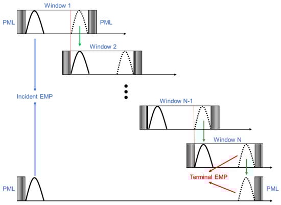 A straightforward application of PSTD to propagation is very wasteful of computer memory since, for a propagating pulse, the energy is essentially confined to a localized portion of the entire path. All the PSTD mesh that is outside of the region containing the significant pulse energy is wasted memory and calculation effort. Since the FFT in the PSTD algorithm requires all spatial points, the memory and computation time required increases as the length of the problem space increases. In addition, the spatial locations at which the waveform has not arrived are meaninglessly involved in the global transformation of the FFT. Therefore, PSTD-4 incorporating the moving window technique [27,28,29] (denoted by MWPSTD-4) is proposed to perform EMP propagation calculations. Both sides of the moving window are set as PML region. When the EMP propagates to the right side of the window, the pulse is recorded, and the window is then moved forward a distance so that the PML region at the left end of the window meets the tail of the wave, and the calculation continues. This operation is repeated until the pulse propagates to the given distance, as shown in Figure 1.