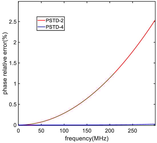 To compare the numerical dispersion properties of PSTD-2 and PSTD-4, we compute the numerical phase velocity using Equations (18) and (19). The frequency ranges from dc to 300 MHz for both methods. The is set as 0.25 m, which is a quarter of the max wavelength. The time step satisfies the stability criterion and is set as 4.16 × 10−10 s. The error in the numerical phase velocity is plotted in Figure 2. At this time step, the numerical phase velocity errors are 2.5% and 0.02% at 300 MHz associated with PSTD-4 and PSTD-2, respectively.