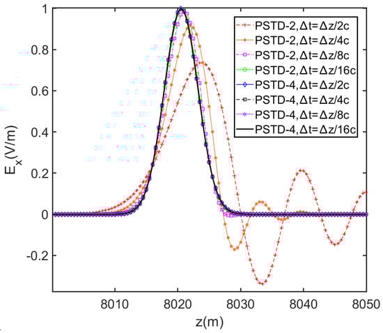 In this section, we present the results of numerical experiments designed to test the performance of the PSTD-2 and PSTD-4 algorithms in long-distance propagation computations. The distance is set to 8 km. A Gaussian pulse with a maximum frequency of 300 MHz is chosen as the source excitation, with a maximum peak value of 1 V/m. The spatial grid cell size is chosen to be , and the time steps are set as , , , and for both PSTD-2 and PSTD-4. Figure 3 and Table 1 show the waveforms after propagation and the CPU time spent, respectively. The computer configuration is as follows: CPU is 13th Gen Intel Core i9-13900K, and the Random Access Memory is 64 GB.