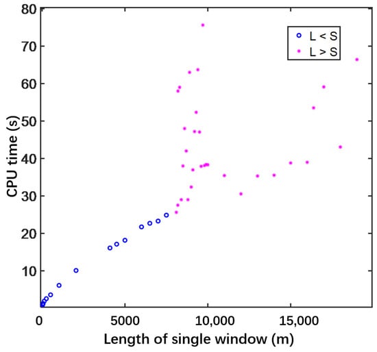 To further improve the computational efficiency, we proposed the MWPSTD-4 algorithm in this paper. In this section, we present the results of numerical experiments designed to test the performance of the PSTD-4 and MWPSTD-4 algorithms in long-distance computations. We study the correlation between the moving window length and CPU time. The Gaussian waveform parameters adopted in this section are consistent with those in Section 3.2; the results are shown in Figure 4.