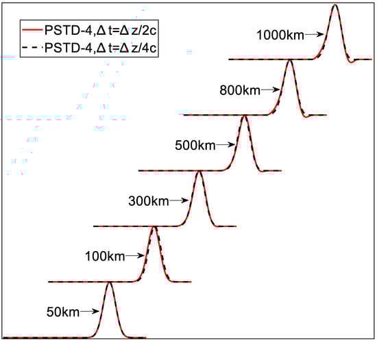 A fourth-order accurate-in-time PSTD algorithm (denoted as PSTD-4) was proposed to further optimize the PSTD algorithm. This method employs the Fourier transform in the spatial domain, while the fourth-order time-accurate difference is applied in the time domain, which greatly reduces the numerical dispersion compared to PSTD-2 [24,25]. Nevertheless, the application of PSTD-4 to long-distance EMP propagation simulations has not yet been validated.