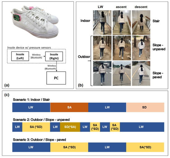 In this study, five WCs are considered, as depicted in Figure 1b: level walk (LW), stair ascent (SA), stair descent (SD), ramp ascent (RA), and ramp descent (RD).