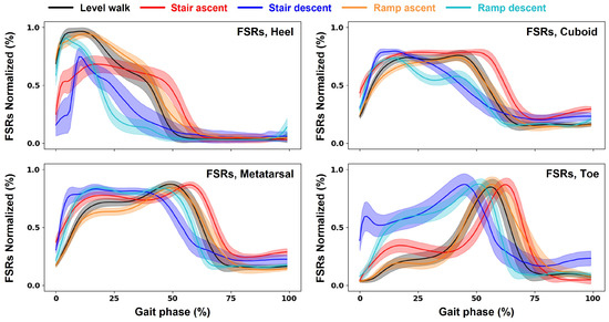 Typical variation of FSR data from Subject 1 measured during multi-locomotion tasks. Data measured at four different locations on the foot while performing walking experiments under five different walking conditions are presented.