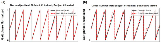 As depicted in Figure 4a, when own-subject data are entered into the proposed model, the estimated gait phase values converge well to the ground truth gait. However, when cross-subject data are entered into the proposed model, the error in the estimated gait phase values increases compared to what is shown in Figure 4a, as shown in Figure 4b.