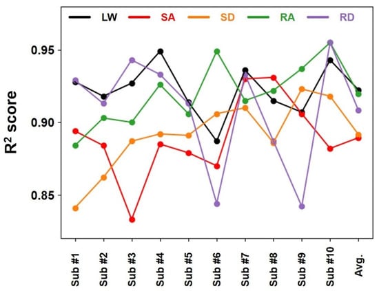 Figure 6 depicts the R2 scores of the developed algorithm with respect to varying WCs. The average R2 score is 0.922 for LW and 0.920 and 0.908 for RA and RD, respectively. Additionally, relatively low average values of 0.889 and 0.892 are observed for SA and SD, respectively. This phenomenon indicates that the cGPE performance is degraded in these two cases because only the fore part of the sole or heel touches the ground while going up or down a staircase, decreasing the fidelity of the aforementioned 14 FSR data.