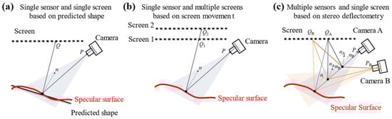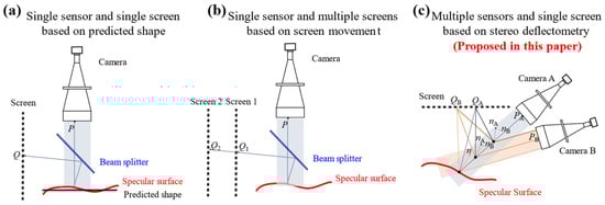 Three typical PMD configurations with endocentric lenses. (a) Single sensor and single screen based on predicted shape; (b) Single sensor and multiple screens based on screen movement; (c) Multiple sensors and single screen based on stereo deflectometry.