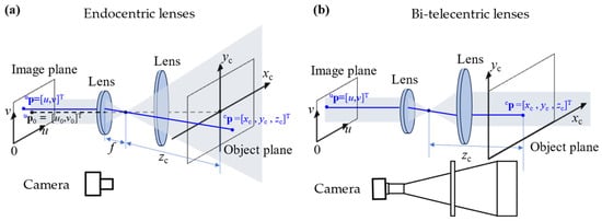 Compared to endocentric lenses in high accuracy machine vision [33], bi-telecentric lenses not only exhibit lower image distortion but also simplify the calibration process [34]. The imaging models of endocentric lenses and bi-telecentric lenses are shown in Figure 3.