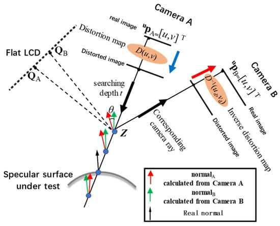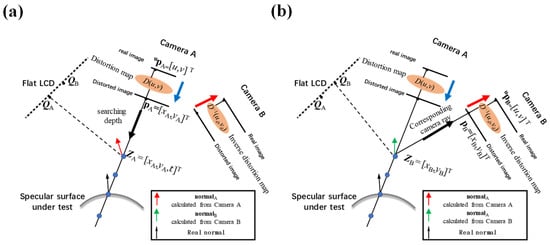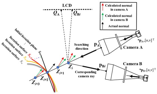 As shown in Figure 5, similar to stereo PMD with endocentric lenses [32], the reconstruction of the SUT in the stereo bi-telecentric PMD system can be accomplished through anchor point positioning, followed by iterative surface S reconstruction.