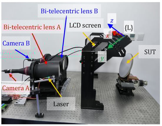 The developed hardware (as shown in Figure 6) includes two bi-telecentric lenses with cameras, a flat LCD screen, and a 535 nm, 50 mW laser diode serving as the laser pointer. Since the mirror surface lacks distinct features, it is necessary to utilize its diffuse reflection characteristics during the anchor point positioning process. This can be achieved by using a laser to mark a spot on the surface that exhibits diffuse reflection properties. The model of the bi-telecentric lenses is TC23144, with a nominal magnification of 0.061. The cameras use the Sony IMX264 CMOS sensor with a resolution of 2448 × 2048. The model of the flat LCD screen is a ViewSonic VP2768 with a resolution 3840 × 2160. The LCD coordinate system {L} takes the first row and first column of the LCD screen as the origin, with the x-axis along the horizontal direction of the LCD screen, the y-axis along the vertical direction of the LCD screen, and the z-axis perpendicular to the screen inward.
