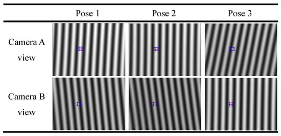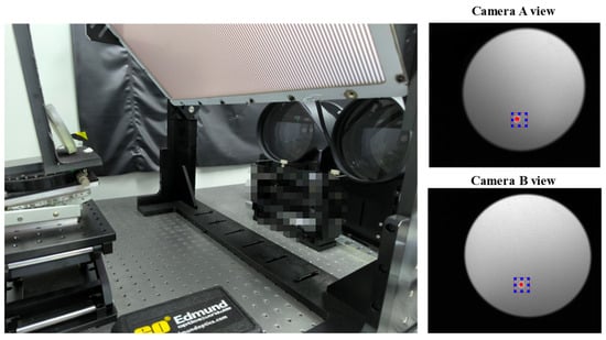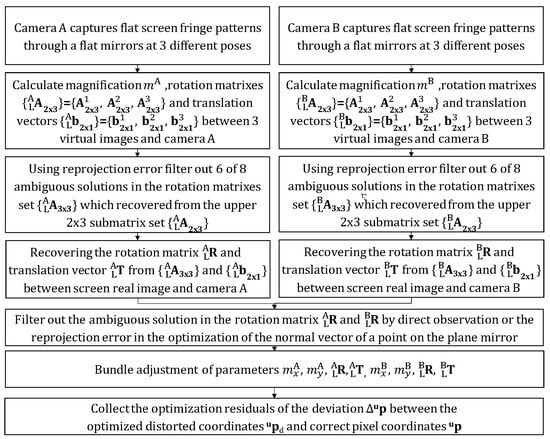 The calibration process starts by placing a flat mirror in 3 different positions, allowing camera A and camera B to capture the phase-shifting fringes on the flat LCD screen (as shown in Figure 7). The red dots in Figure 7 are indicated by the laser pointer for anchor point positioning. And the blue frames are the bounding boxes of the red dots. To obtain reliable calibration results, nonlinear errors need to be suppressed [51]. By the optimal phase-shifting technique [52], the corresponding physical position pL = [xL, yL,0]T in the flat LCD coordinate system {L} of camera pixel up = [u, v]T can be acquired. Because the LCD is flat, the z-value of pL is always zero. So the 3D point pL = [xL, yL,0]T can be noted as a 2D point pL = [xL, yL]T. Its coordinate in camera B’s local coordinate system {B} is also a 2D point pB = [xB, yB]T. For camera B, the geometric relationship is drawn in Figure 8.