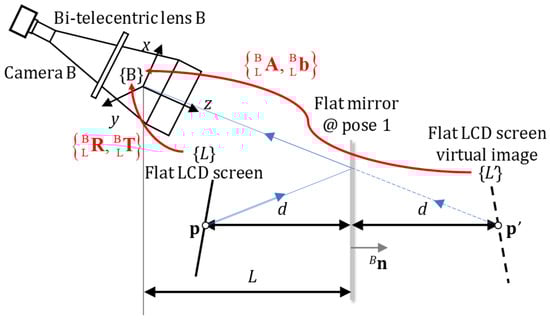 The rotation matrix (whose determinant is −1) and the translation vector represent the position relationship between the flat LCD screen virtual image coordinate system {L’} and camera B’s local coordinate system {B} when the flat mirror is at pose 1. The normal of flat mirror in {B} can be noted as Bn = [nx, ny, nz]T. The distance between the origin of {B} and the flat mirror is noted as L.