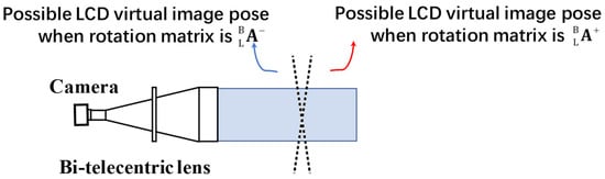 It should be noticed that has an ambiguous solution. These two solutions are noted as and . The reason why there are two solutions of is that the bi-telecentric lenses perform parallel projection, and cannot identify the depth. Figure 9 shows the geometric relationship of the two possible LCD virtual images, which the bi-telecentric lenses cannot identify.