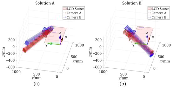 It is very important to know that the ambiguous solution of may cause an increase in error. The rotation matrix at three different LCD virtual image positions, with each position having two solutions, results in a total of eight possible solutions. Table 3 and Table 4 show the reprojection error and solutions of Equation (28) at these eight possible solutions for camera A and B, respectively. For every camera, six incorrect solutions can be eliminated from the Error, leaving two solutions marked in red and blue in Table 3 and Table 4.
