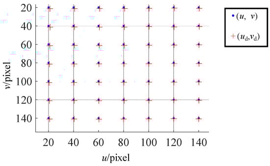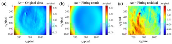 The accuracy of the constructed inverse distortion maps can be indicated by the reprojection errors Erroru and Errorv according to Equation (43). The reprojection errors are shown in Figure 18c,f. The construction results of the inverse distortion maps for camera B are shown in Figure 19. The majority reprojection errors in both u and v directions for both cameras are both below 0.1 pixel. This is lower than the reprojection errors of the polynomial fitting method.