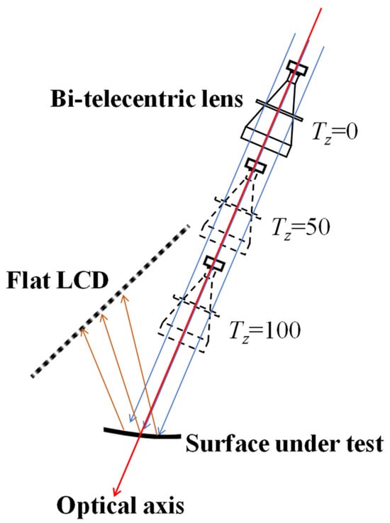 As shown in Figure 4b, Niu et al. [40] and Huang et al. [41] position the LCD screen perpendicularly to the optical axis of the bi-telecentric imaging system. This approach eliminates ambiguity in the LCD screen’s rotation matrix, enabling the implementation of a single-sensor-multiple-screens phase-measuring deflectometry (PMD) using bi-telecentric lenses.