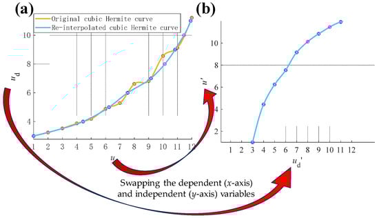 An example for inverse distortion map construction in u direction by cubic Hermite interpolation. (a) The distortion map D and the resampling process; (b) The constructed inverse distortion map D−1.
