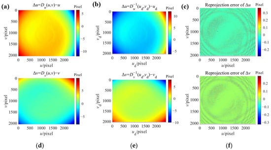 The construction of the inverse distortion maps for camera B. (a) The distortion map Du in u direction; (b) The constructed inverse distortion map Du−1 in u direction; (c) The reprojection error of the constructed inverse distortion map in u direction; (d) The distortion map Dv in v direction; (e) The constructed inverse distortion map Dv−1 in v direction; (f) The reprojection error of the constructed inverse distortion map in v direction.