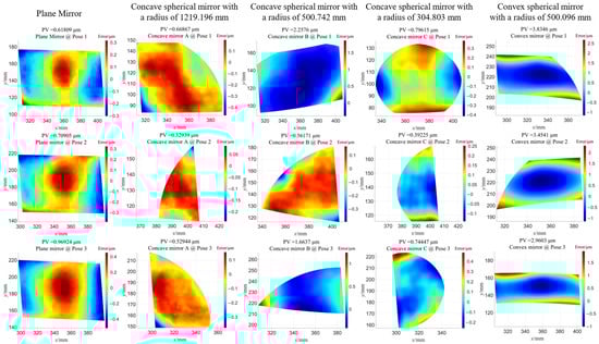 In order to quantitatively evaluate the reproducibility of the proposed stereo dual telecentric PMD, five different aperture and curvature mirrors were used to measure at different positions in the measurement space. The reference radii of all mirrors have been calibrated by the 3D optical profilometer LUPHOScan 260 HD from Taylor Hobson. The corresponding measurement errors are summarized in Figure 22.