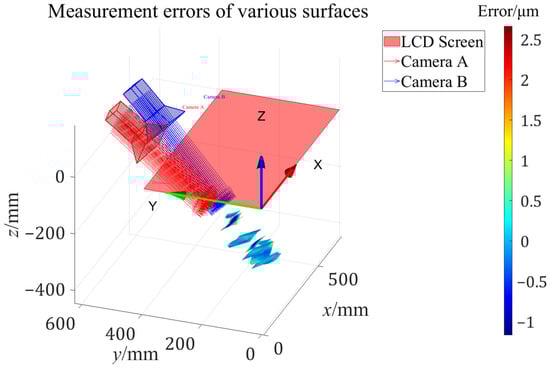 The geometric relationships between the various measured mirrors and the calibrated stereo bi-telecentric PMD in {L} are shown in Figure 23. The study shows that the proposed approach can achieve a measurement accuracy of less than 3.5 μm (Peak-to-Valley value) within 100 mm (Width) × 100 mm (Height) × 200 mm (Depth) domain for various surfaces. The proposed method does not require the help of a micro-positioning stage in the bi-telecentric lens calibration process to resolve the ambiguity of the rotation matrix in the extrinsic parameters. The accurate calibration results and inverse distortion maps allow for obtaining reliable measurement results without restricting the placement of the SUT.
