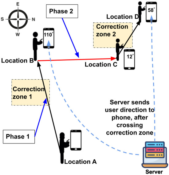 - Finally, the phone computes user’s location using the corrected walking direction. Phase 1 repeats when the user moves into a next correction zone.